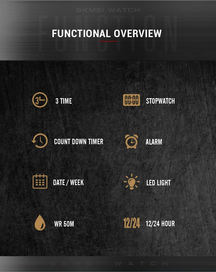 8.Function:3Time, Chrono, Alarm,Date, Week, LED Light,12/24 hour clock,Count down timer.